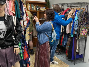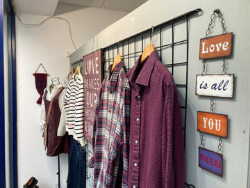 A mountain of used men's shirts piled up on our crafts table at the back of our Green Heart shop.
