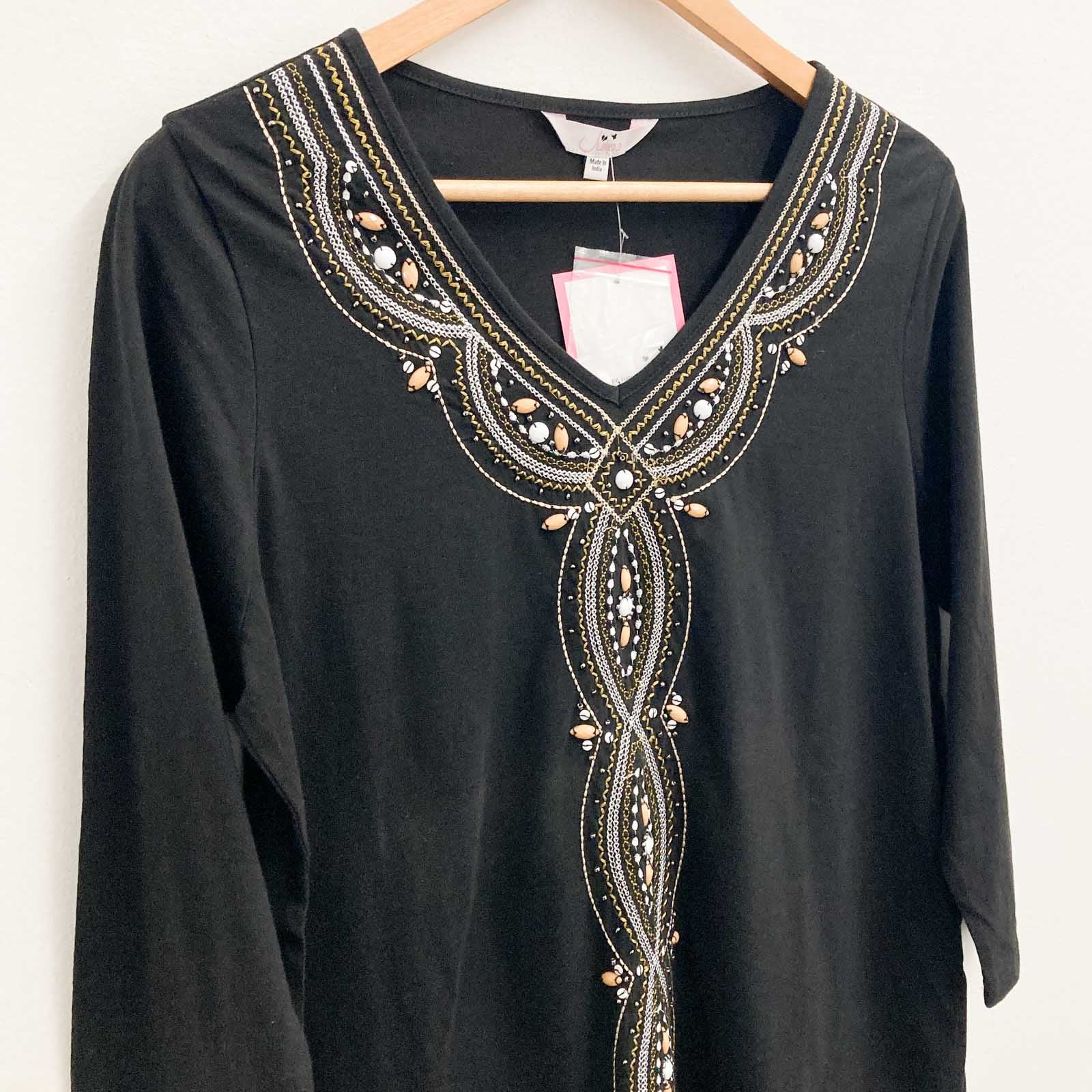 Julipa black beaded and embroidered v-neck 3/4 sleeve top in UK 14. Features: - Bead embellishments and embroidery on the front - 100% cotton New with tags and no obvious flaws.