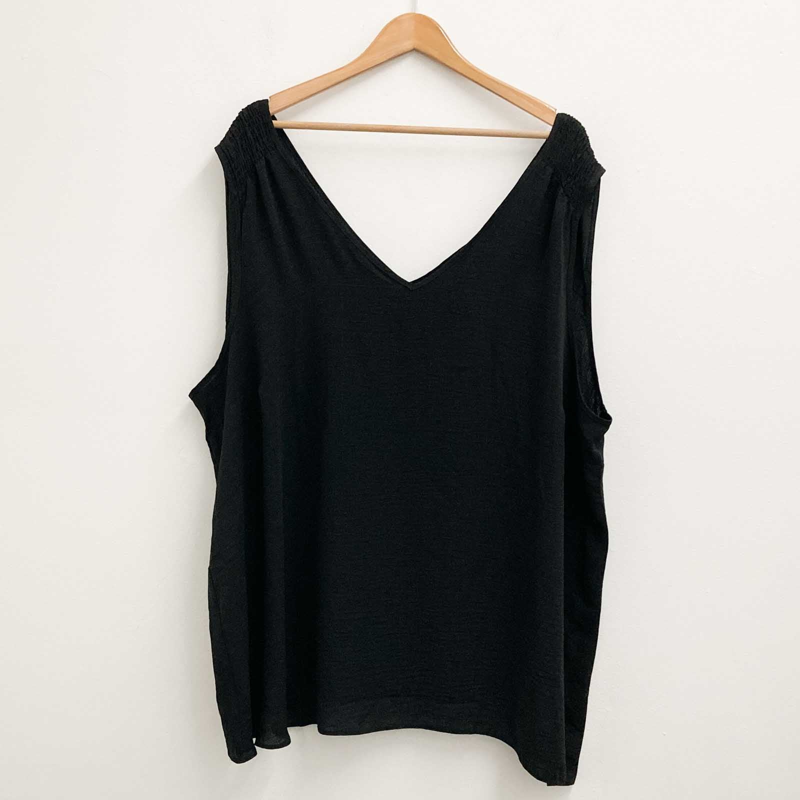 Evans black shirred shoulder sleeveless v-neck top in UK 30. Key Features Include: - V-neckline - Sleeveless - Pullover style - Darted bust for shape - Non-stretch fabrication - Unlined - Hip length hemline New with tags and no obvious flaws.Details