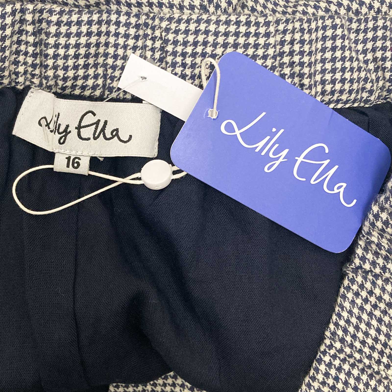 Lily Ella navy and stone dog tooth cotton straight leg trousers in UK 16. Features: - Elasticated waist - Front button and zip fastening - Angled front pockets - Back patch pockets - Lined Brand new with tags and no obvious flaws.
