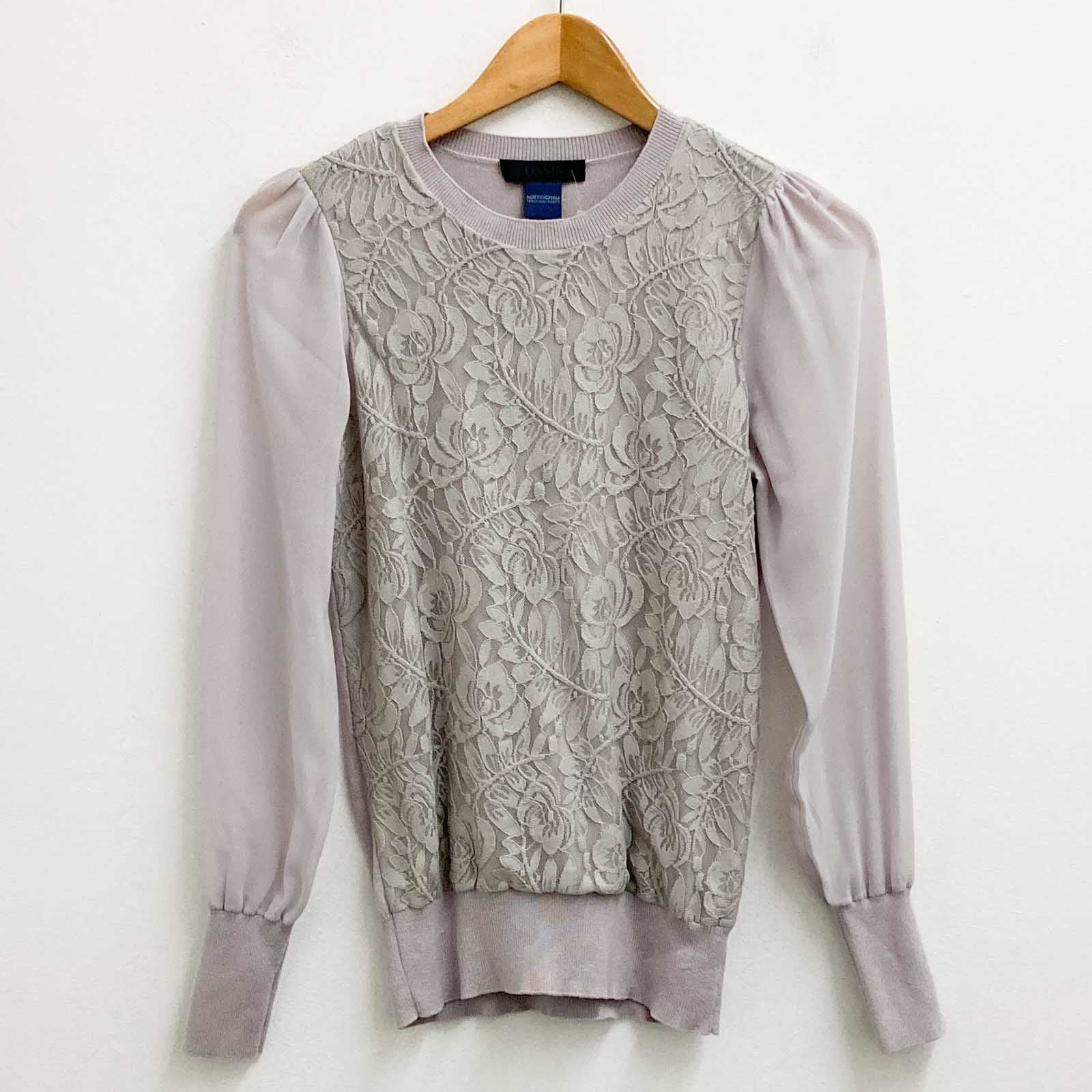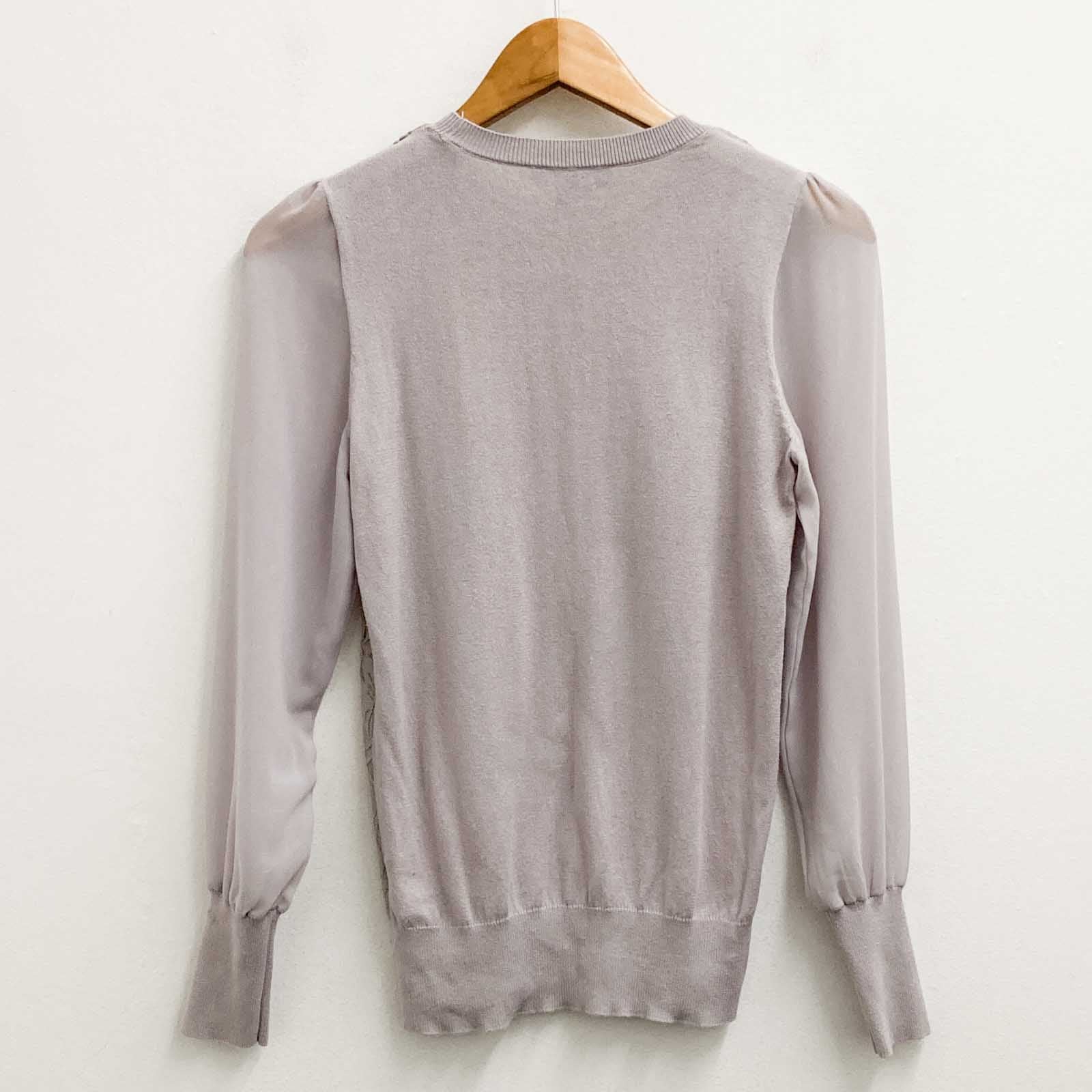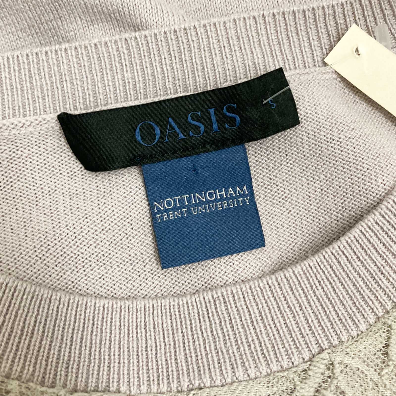 Oasis light taupe/grey jumper with chiffon sleeves and floral lace overlay front. Size S. Features: - Knit body with floral lace overlay front - Long sheer chiffon sleeves with knit cuff In good used condition with no obvious flaws.Details