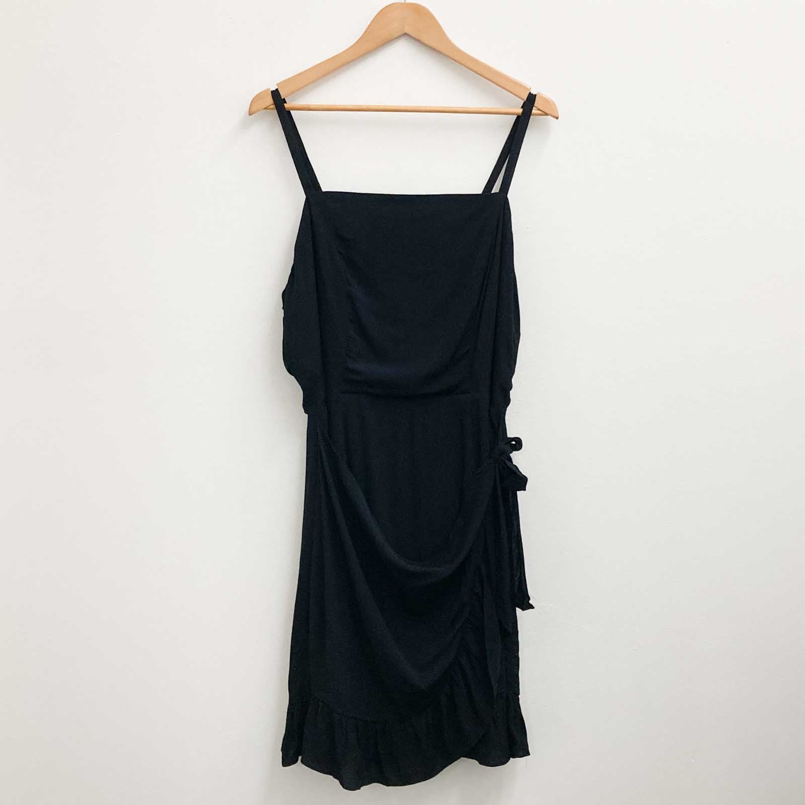 City Chic black sleeveless frill hem tie waist overlay dress in UK 14. Key Features Include: - Straight neckline - Thin adjustable straps - Shirred back - Tie waist overlay detail - Fully lined - Pullover style - Frilled hemline New without tags and no obvious flaws.Details