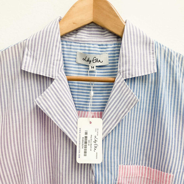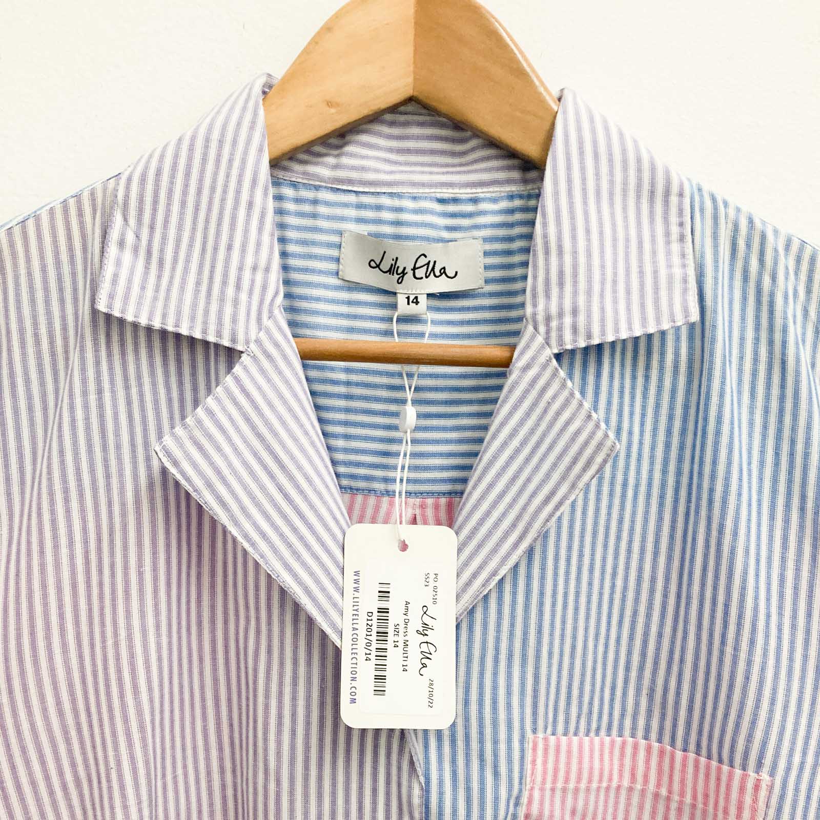 Lily Ella blue and pink striped cotton midi shirt dress in UK 14. Features: - 3/4 sleeves with turn back cuffs - Bust darts - Collar and lapel - Front patch pocket - Centre back pleat - Curved hem Brand new with tags and no obvious flaws.Details