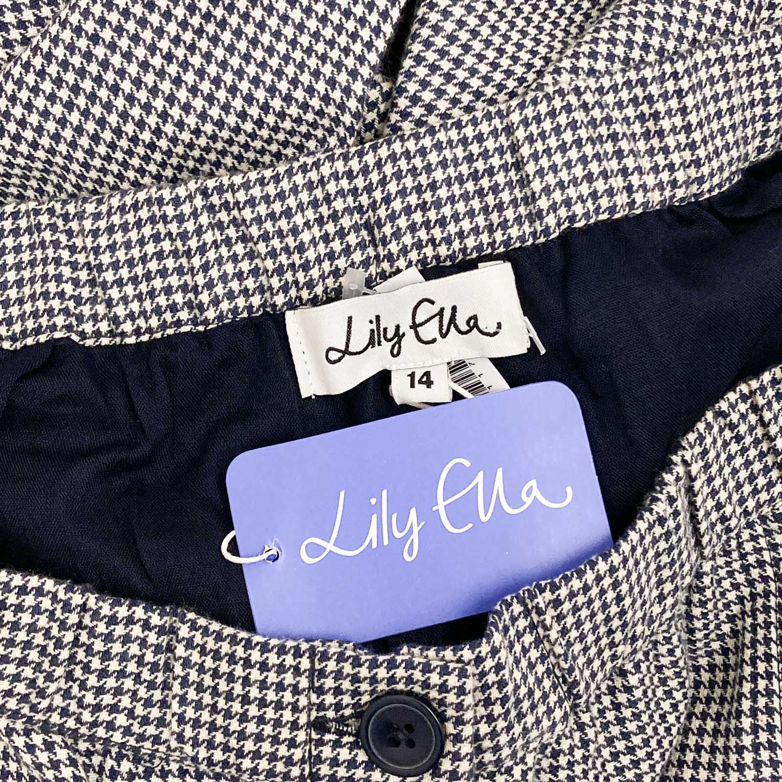 Lily Ella navy dog tooth straight leg cotton trousers in UK 14. Features: - Fully elasticated waist - Front button and zip - Angled front pockets - Back patch pockets - Fully lined Brand new with tags and no obvious flaws.Details