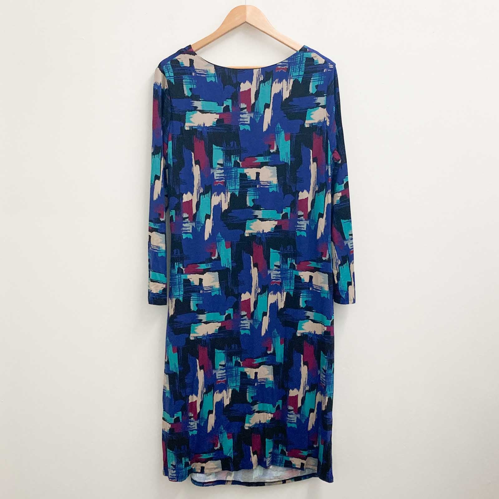 Lily Ella blue abstract print tie side stretch jersey dress in UK 16. Features: - Long sleeves - Knee length - Lined Brand new with tags and no obvious flaws.Details