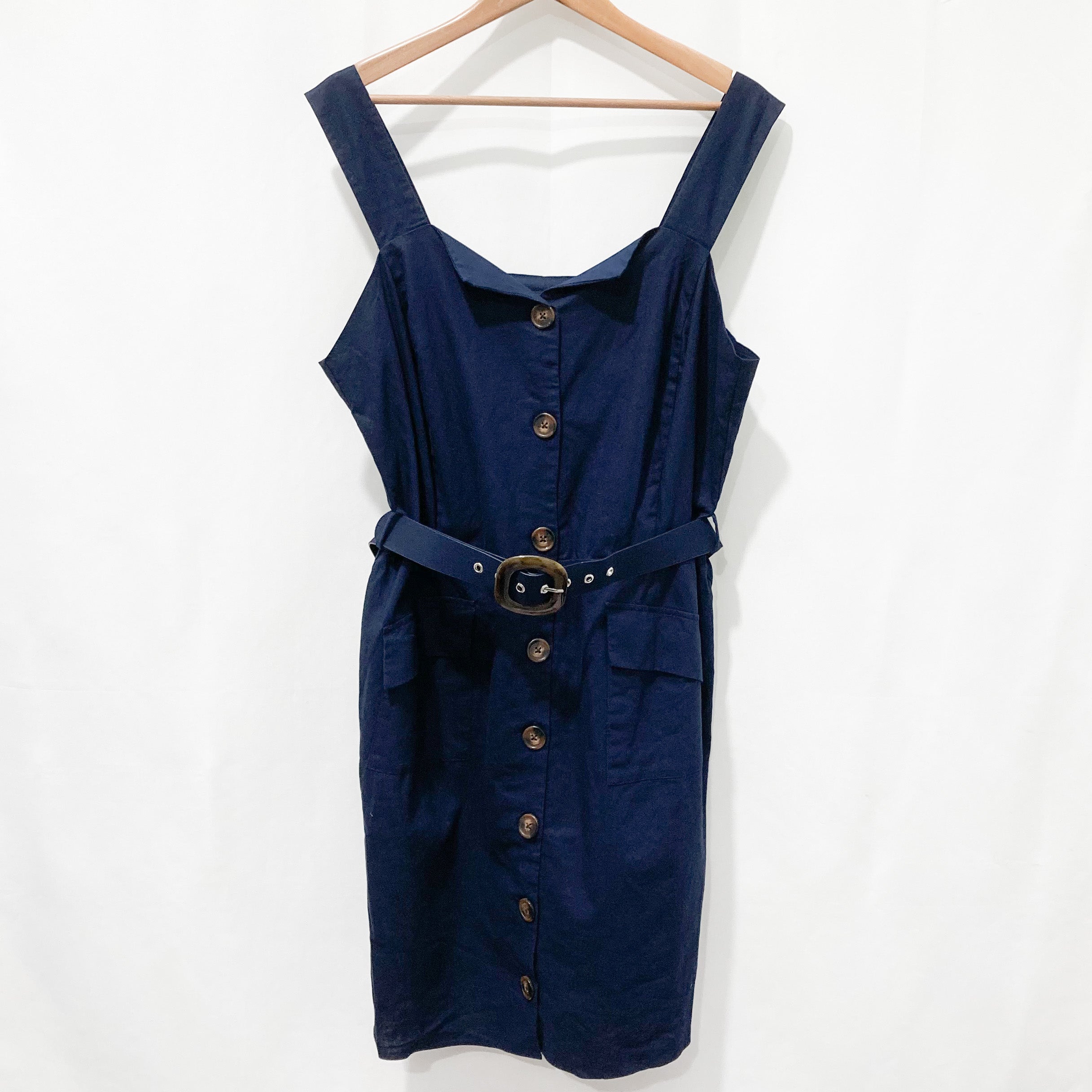 City Chic navy linen blend sleeveless belted dress in UK 16. Key Features Include: - Sweetheart neckline - Tortoiseshell buttons through front - Thick shoulder straps - Functional front pockets - Removable and adjustable belt to waist - Non-stretch Linen and Cotton blend fabric - Lined New with tags and no obvious flaws.Details