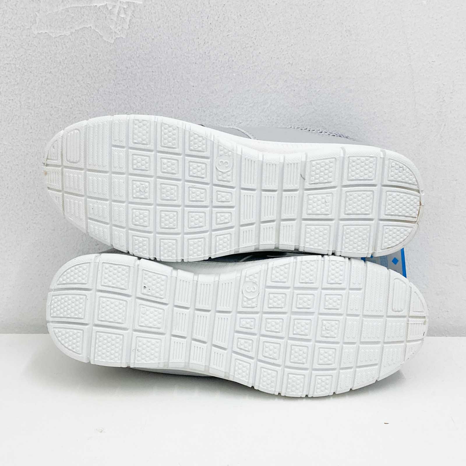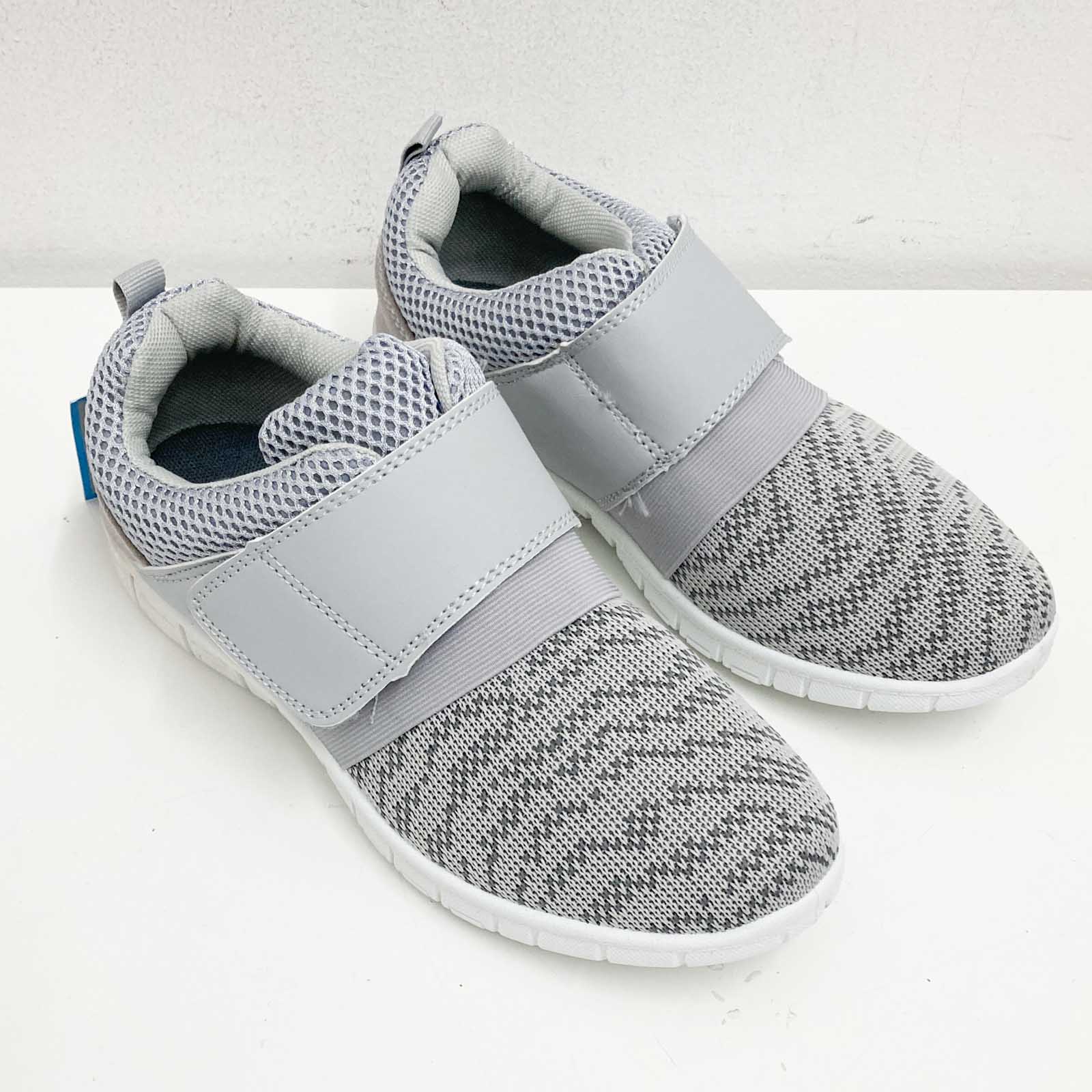 Mercury grey lightweight mesh trainers with grip sole and hook and loop fastening. UK 3. Features: - Hook and loop strap across the top - Grip sole - Lightweight mesh fabric upper New in box. Some marks on the heel of each trainer as shown in photos.Details