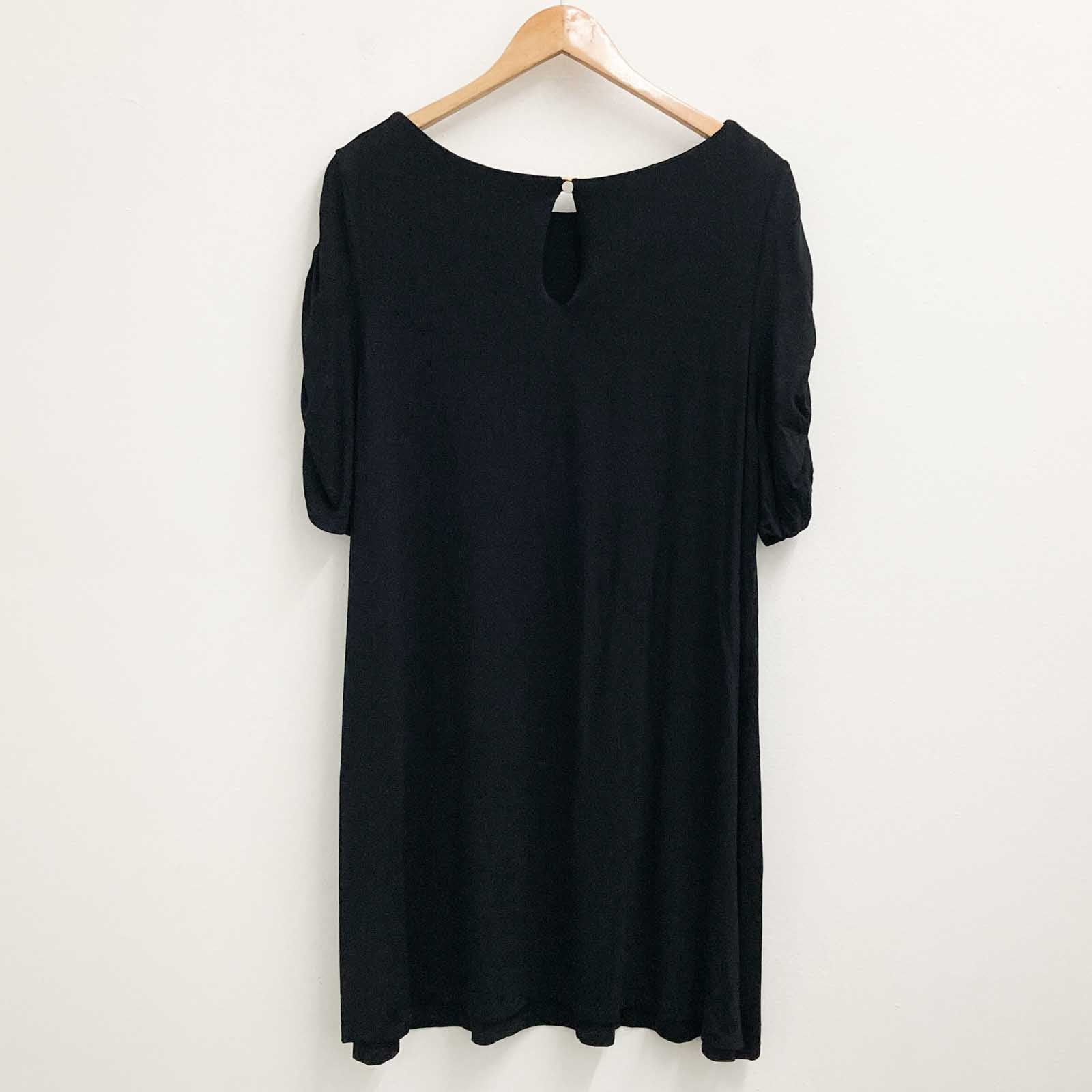 Evans black ruched shoulder plain short dress in UK 16. Key Features Include: - Curved neckline - Elbow length sleeves with elasticated ruched detail - Back button closure with keyhole - Relaxed swing fit - Above knee hemline New with tags and no obvious flaws.Details