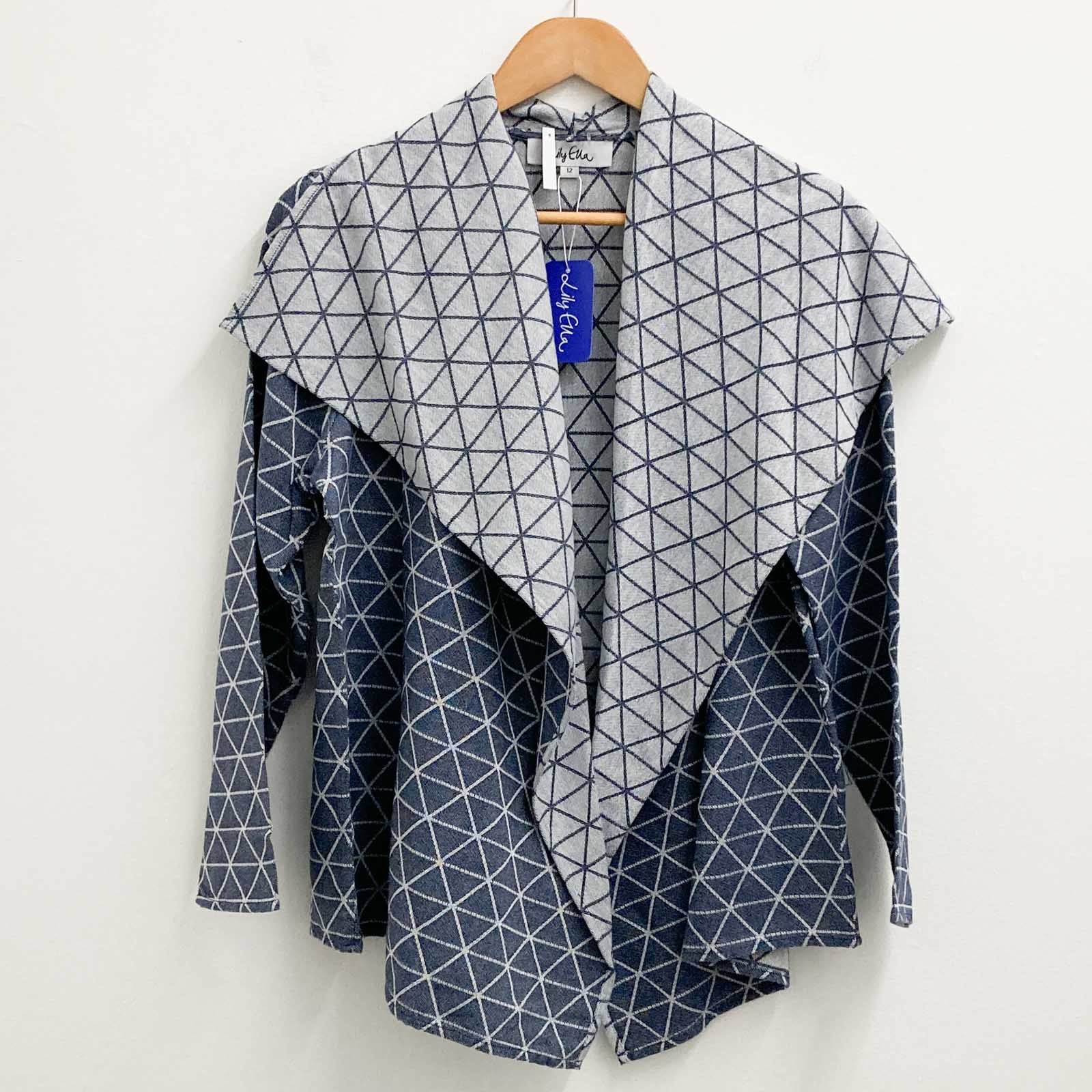 Lily Ella blue/grey waterfall edge unlined cotton open front jacket in UK 12. Features: - Long Sleeves - Waterfall edge - Unlined Brand new with tags and no obvious flaws.Details