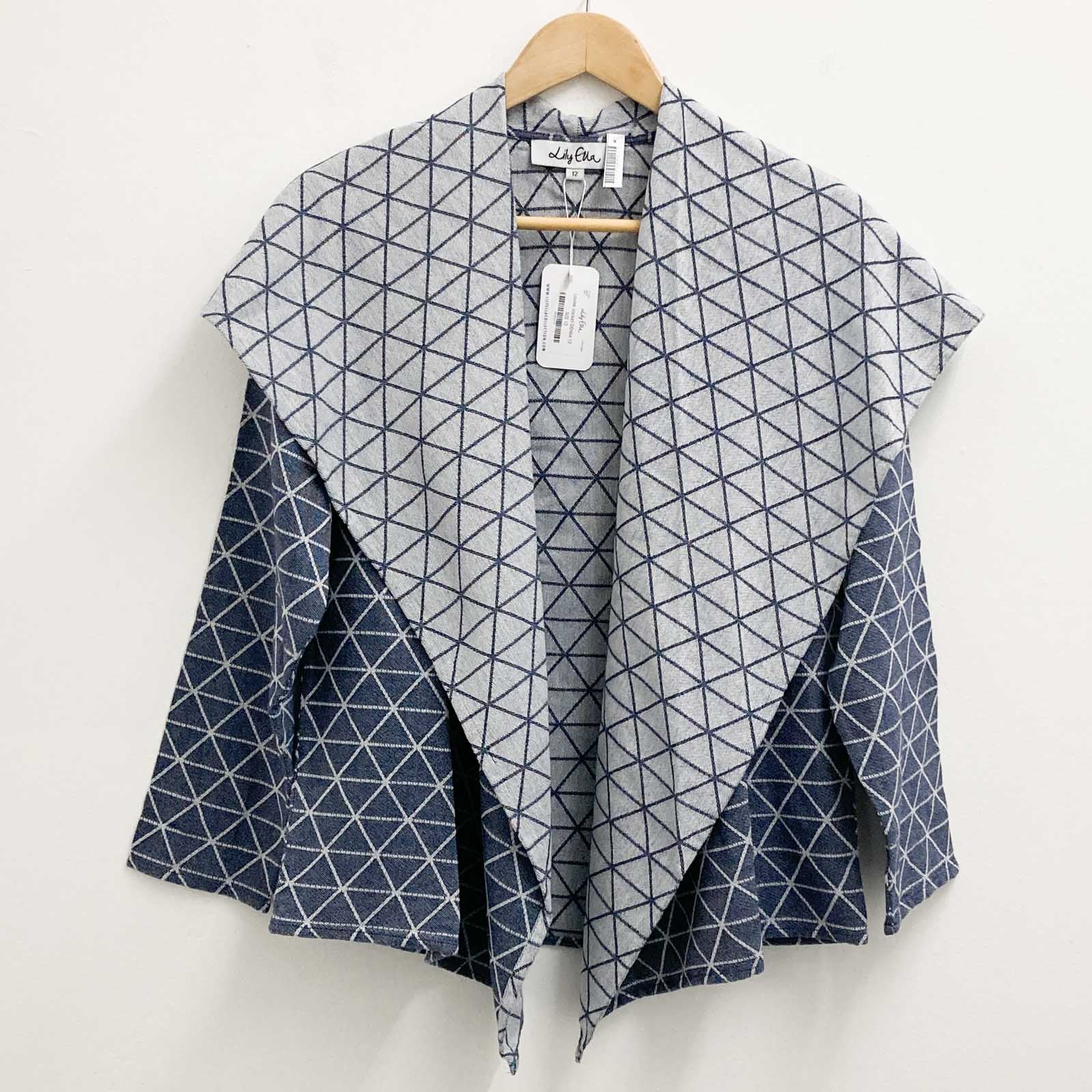Lily Ella geo patterned denim look open front jacket in UK 12. Features: - Long Sleeves - Waterfall edge - Unlined Brand new with tags and no obvious flaws.Details