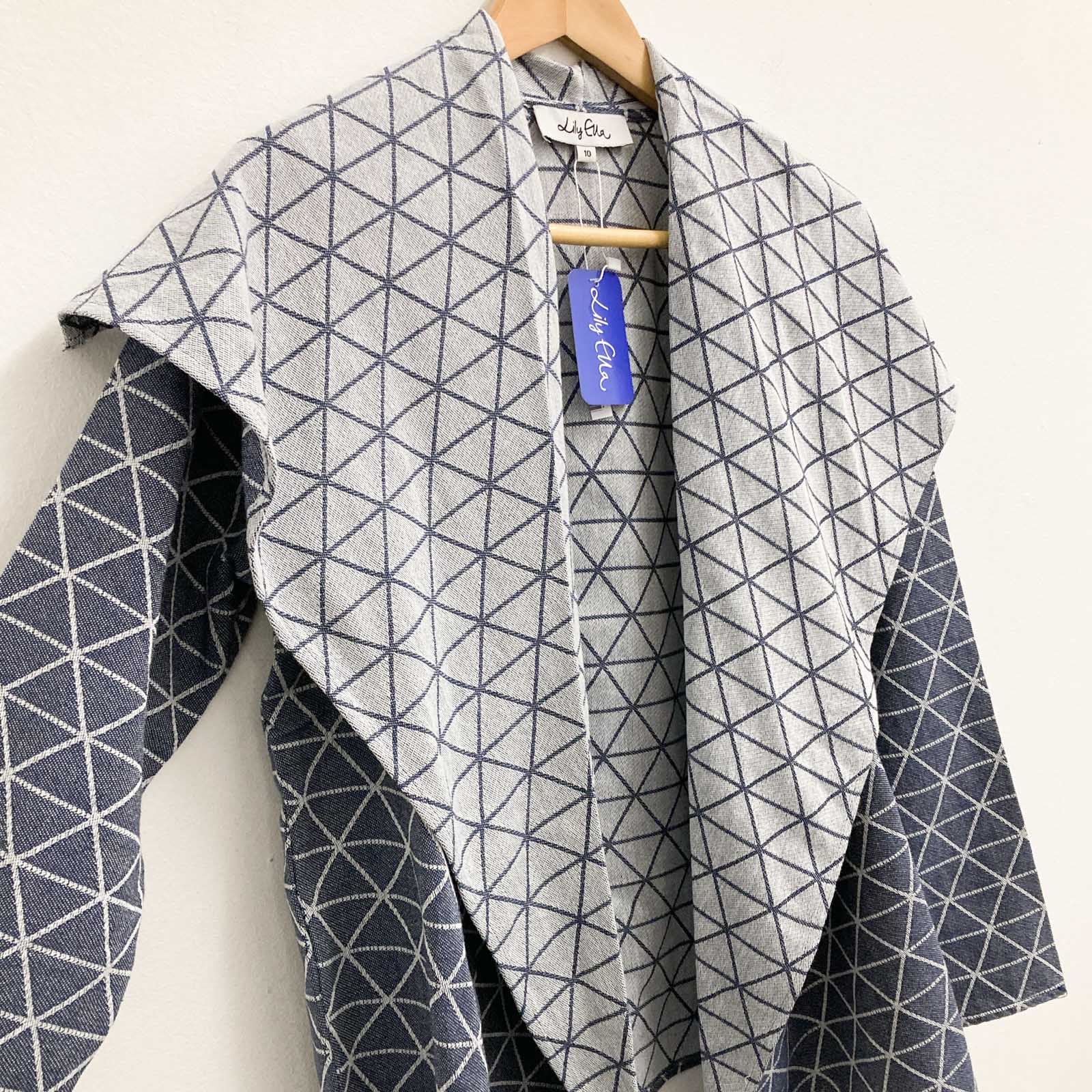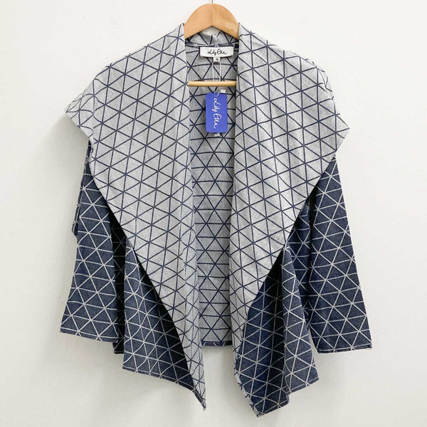 Lily Ella blue/grey open waterfall front denim look patterned jacket in UK 10. Features: - Long Sleeves - Waterfall edge - Unlined Brand new with tags and no obvious flaws.Details