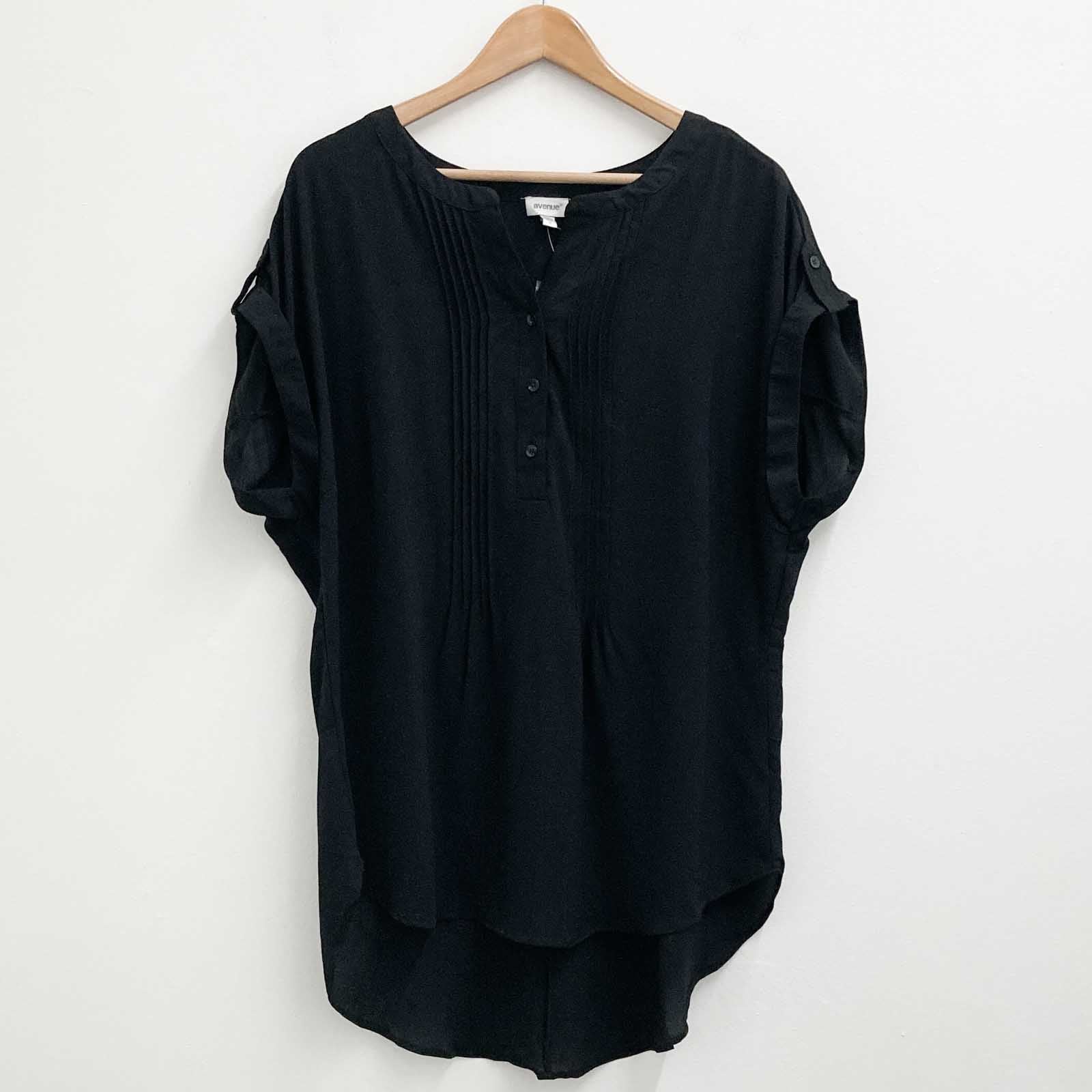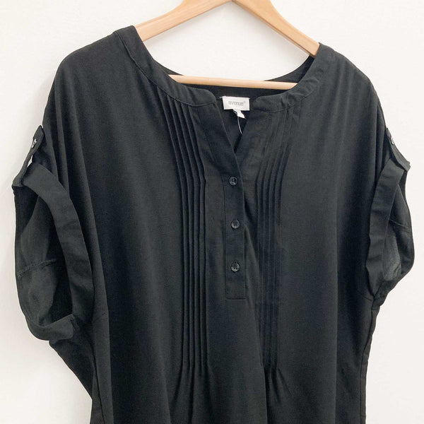 Avenue black button pleat notch v-neck top in UK 20. Key Features Include: - Notch V-neckline - Short sleeves with button tab detail - Pullover style - Functional button detail to bodice - Darted bust for shape - Layered pleat detailing - Relaxed fit - Textured non-stretch fabrication - Hi lo hemline New with tags and no obvious flaws.Details