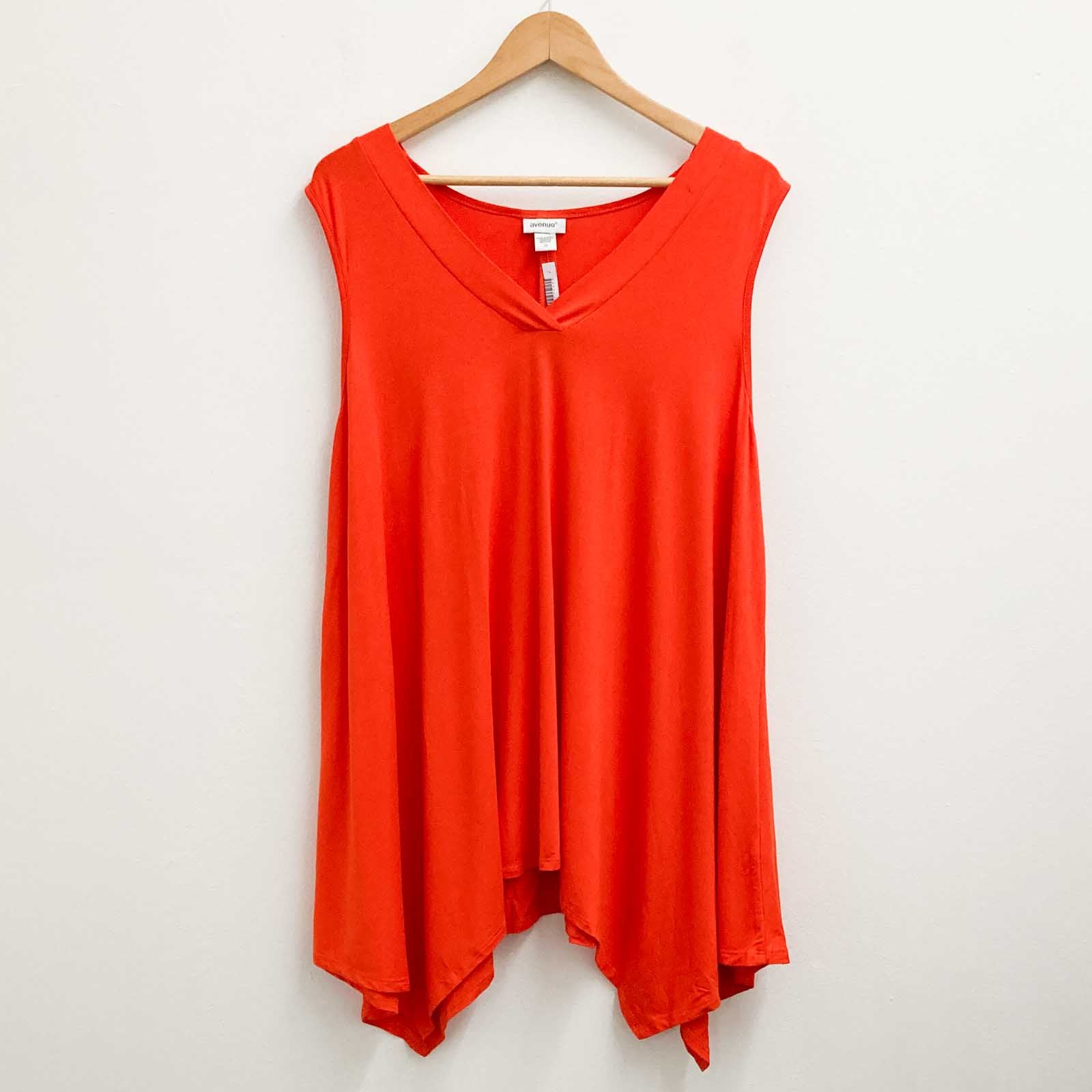 Avenue orange sleeveless v-neck swing tank top in UK 20. Key Features Include: - V-neckline - Sleeveless tank cut - Pull-over style - Relaxed swing silhouette - Soft stretch fabrication - Sharkbite hemline below hips New with tags. Small mark along the neckline at the front (see photos).Details