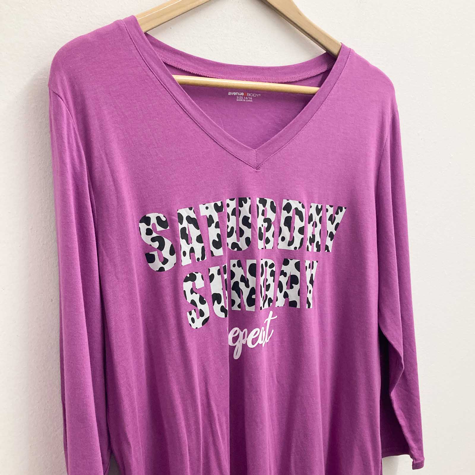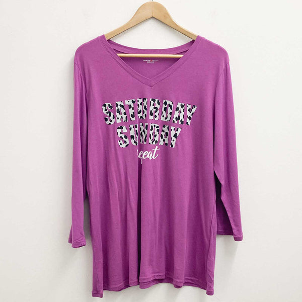 Avenue purple weekend print 3/4 sleeve v-neck sleep top in UK 14/16/ Key Features Include: - V-neckline - 3/4 length sleeves - Pull-over fit - Slogan print - Soft stretch fabrication - Relaxed silhouette - Hip length New without tags and no obvious flaws.Details
