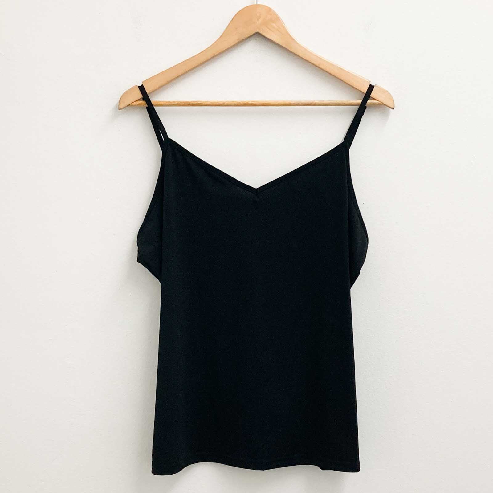 Fabric Composition One black cami and peach cami: 100% polyester. Other black cami: 95% polyester, 5% elastane.