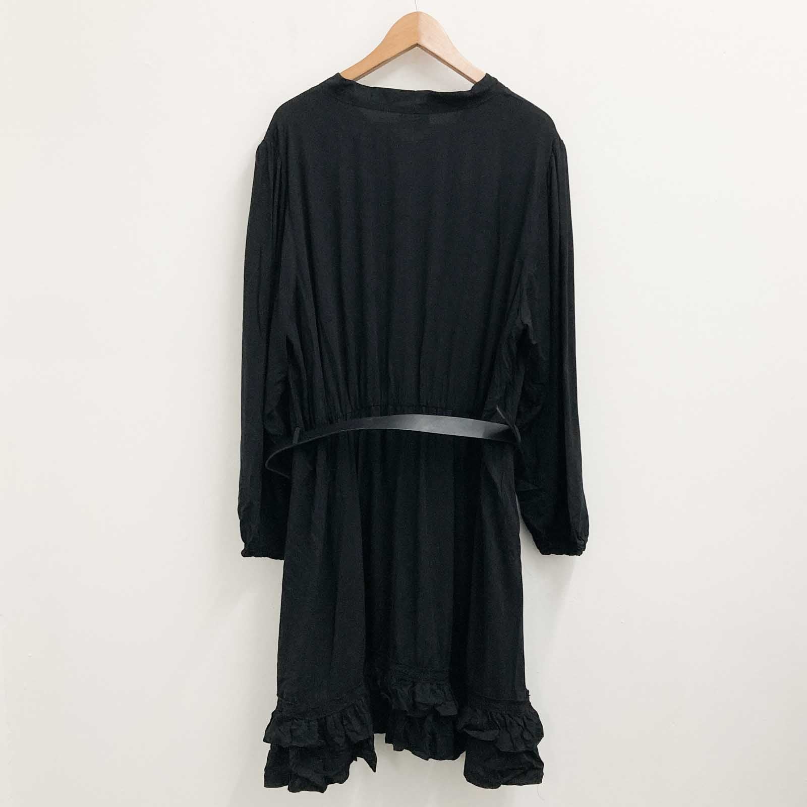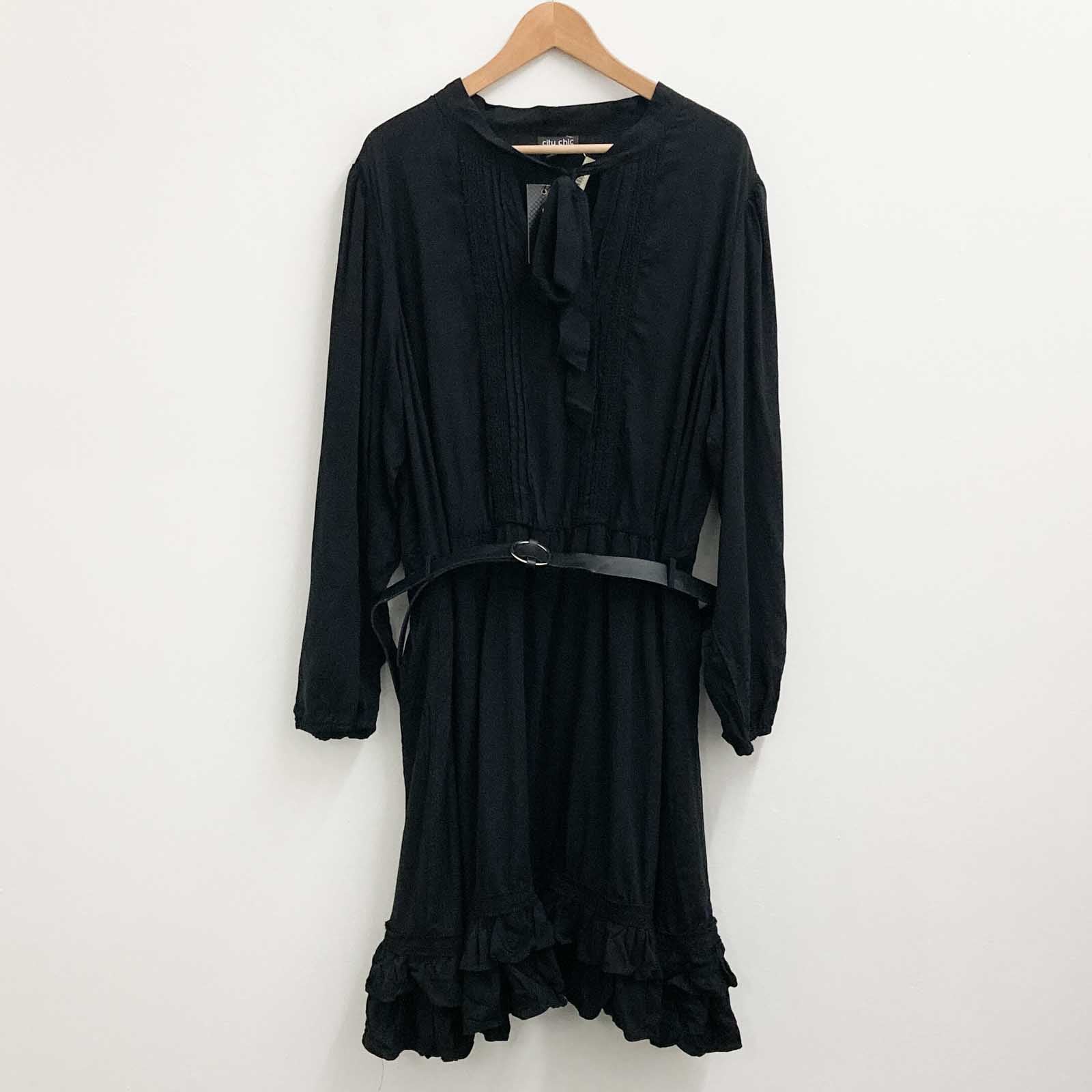 City Chic black tie neck long sleeve belted short dress in UK 20. Key Features Include: - Rounded neckline with adjustable tie - Notched opening to front - Pleated lace embroidered details to front - Long sleeves with button cuffs - Adjustable leather-look belt to waistline - Frilled kick to hemline - Above knee length - Unlined New with tags and no obvious flaws.Details