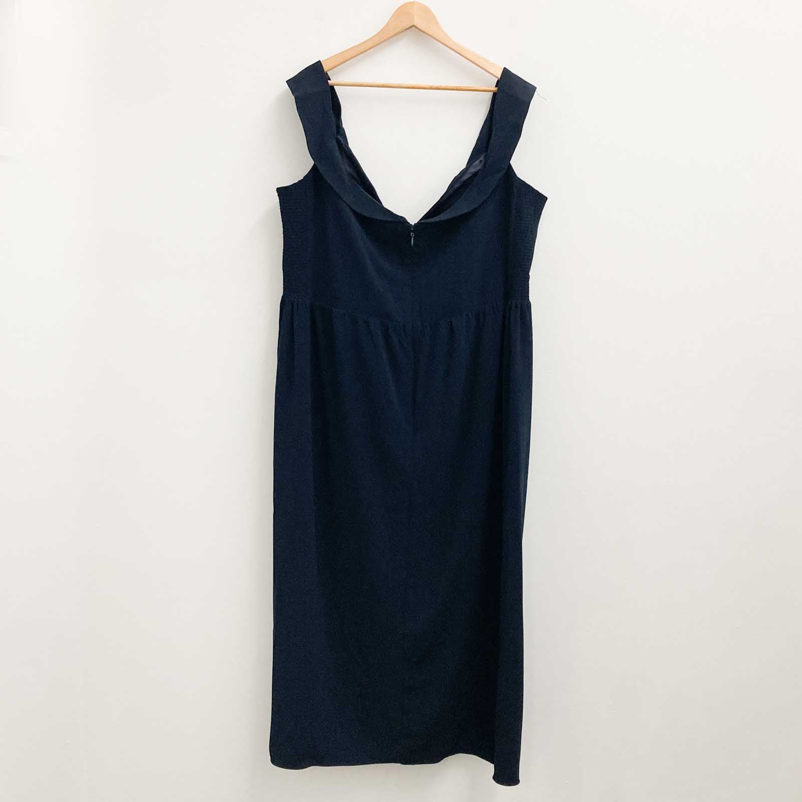 City Chic navy faux wrap off shoulder dress in UK 24. Key Features Include: - Off shoulder V-neckline - Bust pleating above an empire line waist - Faux wrap skirt - Invisible zip closure - Flex fit elasticated shirring on sides for comfort - Soft woven fabrication - Fully lined - Tulip hemline New with tags and no obvious flaws.