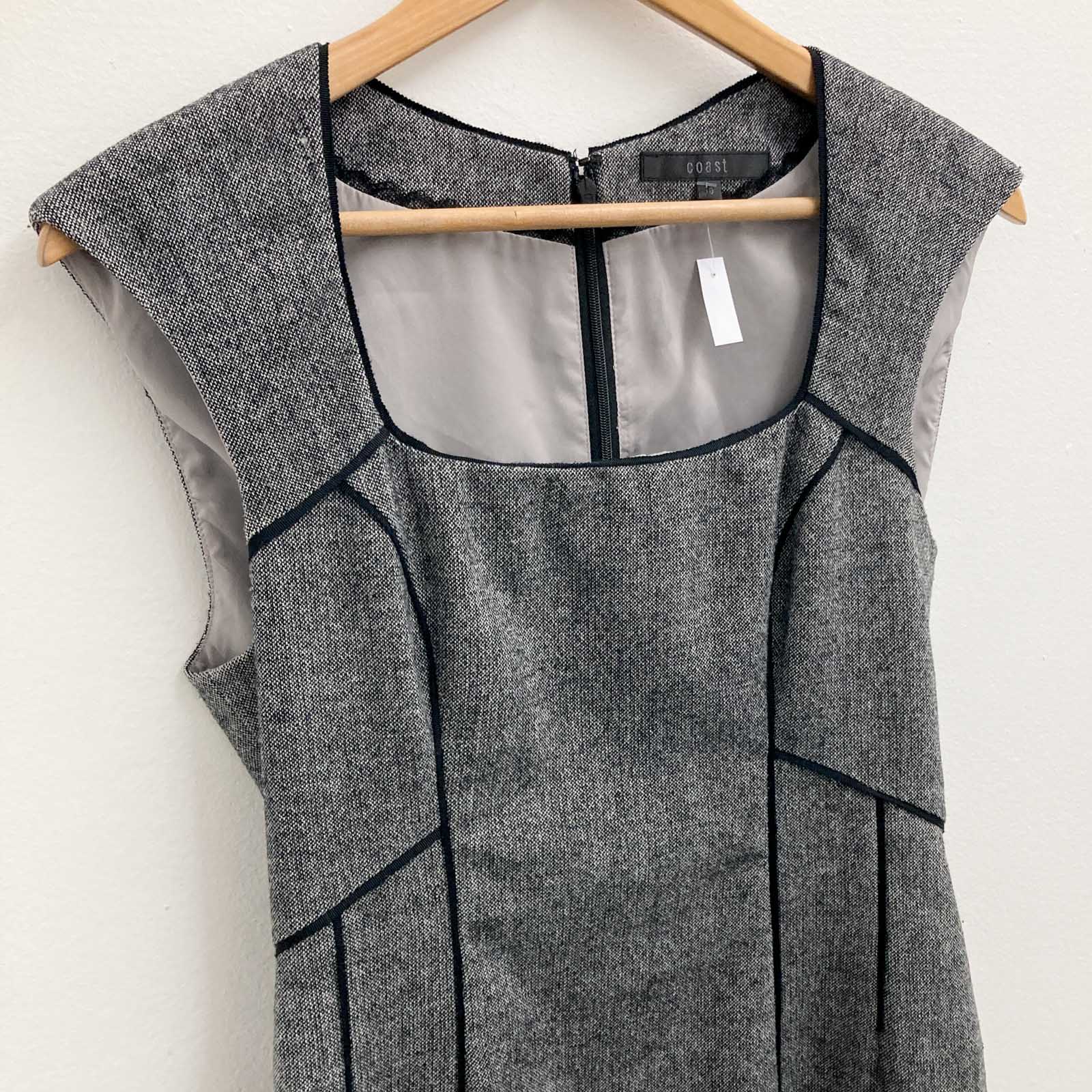 Coast Grey Woven Wool Mix Dress UK 10 Key Features Include: - Round neckline - Cap sleeves - Fully lined with lace trim - Back zip closure Used, good condition. Some pilling to fabric.Details