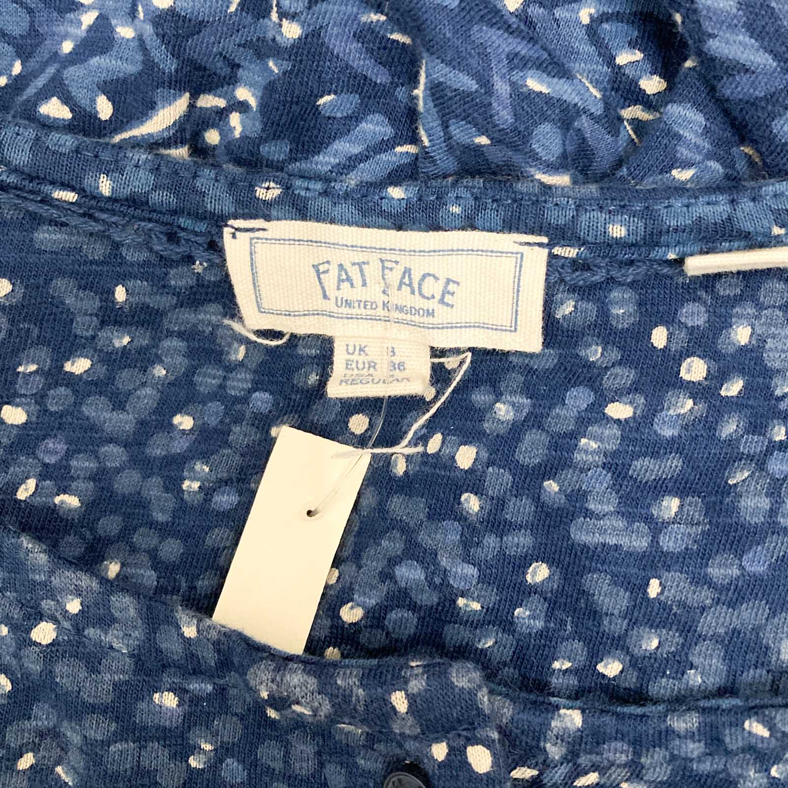 FatFace blue printed 3/4 sleeve fit and flare short jersey dress in UK 8. Features: - Round neckline - Concealed buttons to waist - Unlined In very good used condition with no obvious flaws.Details