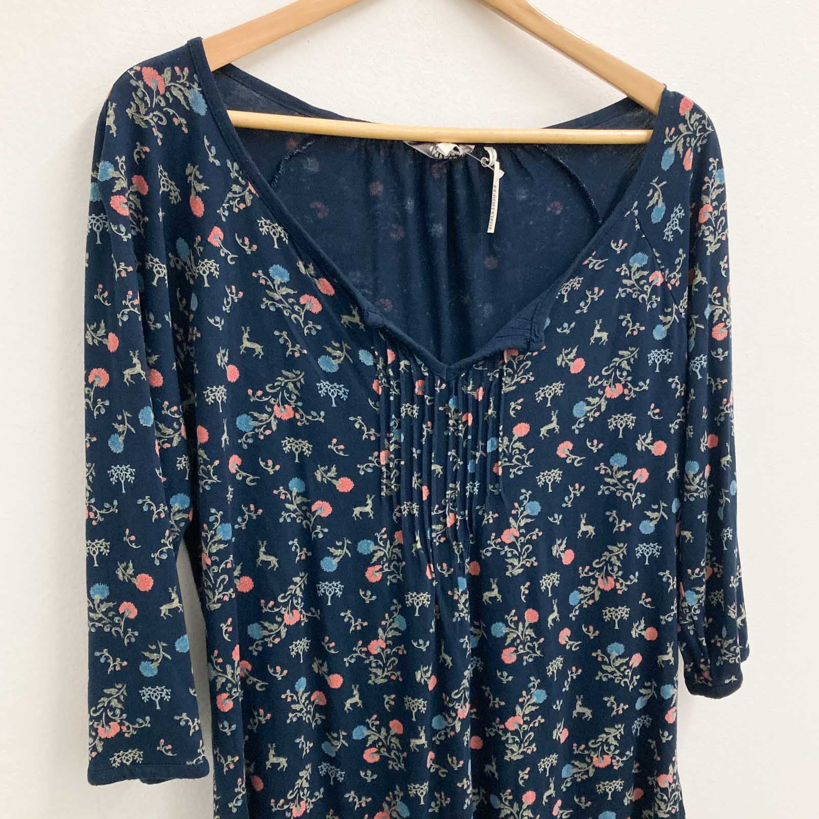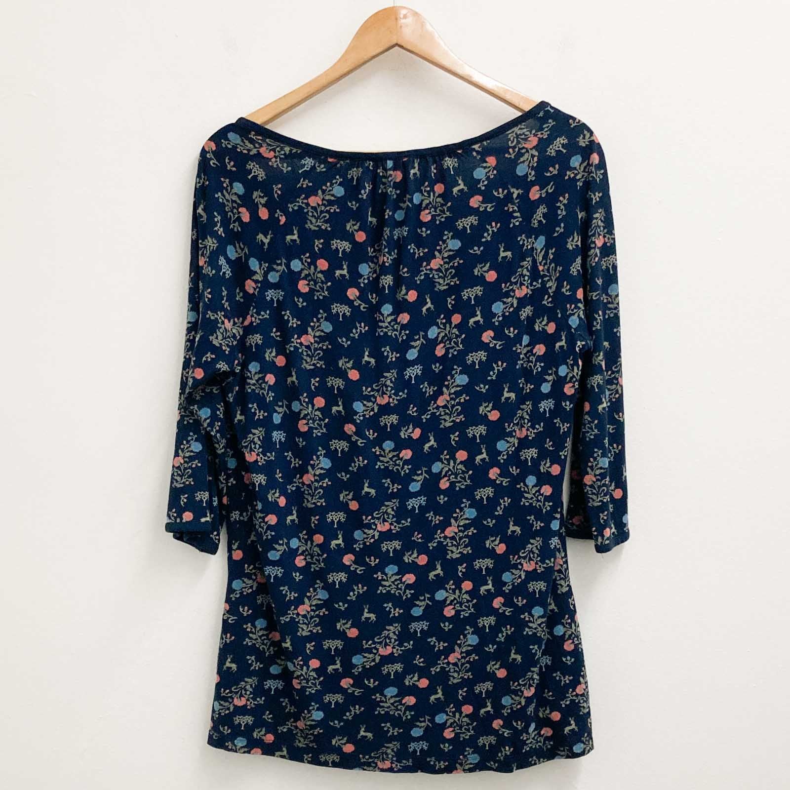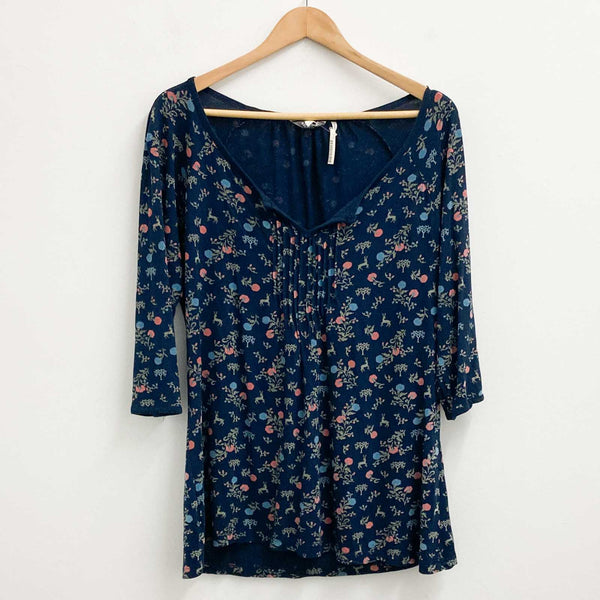 FatFace Top UK 12 Navy Floral Print 3/4 Sleeve Notch Neckline