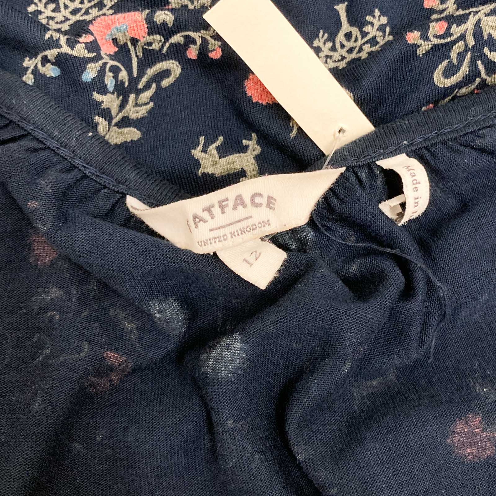 FatFace navy floral print 3/4 sleeve notch neckline top. UK 12. Features: - Soft stretch viscose jersey fabric - Pintuck pleat detailing at the front In very good used condition with no obvious flaws.Details