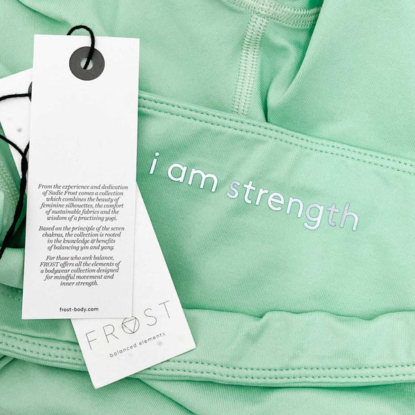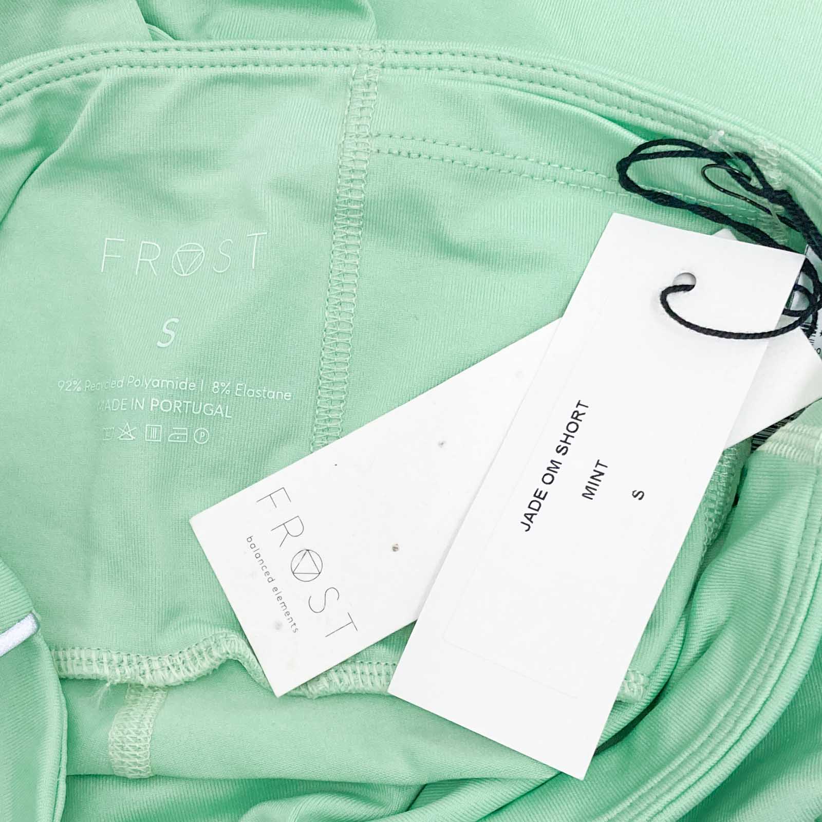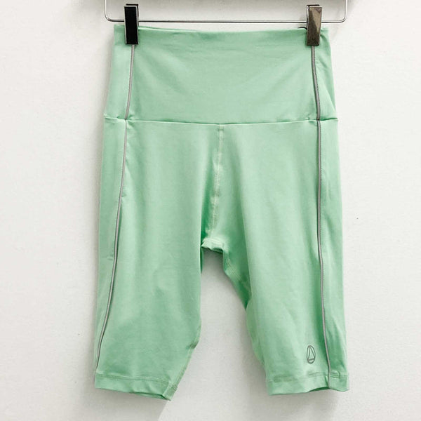 Frost Body by Sadie Frost mint green Jade Om cycling/yoga shorts in size S. The shorts feature reflective piping detail on the sides and a hidden 'i am strength' affirmation graphic on the internal waistband. Made in Portugal. New with tags and no obvious flaws.Details
