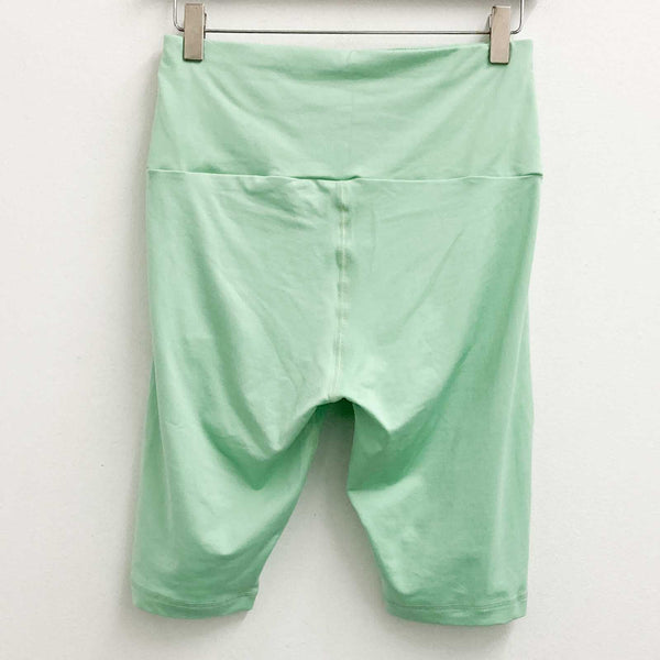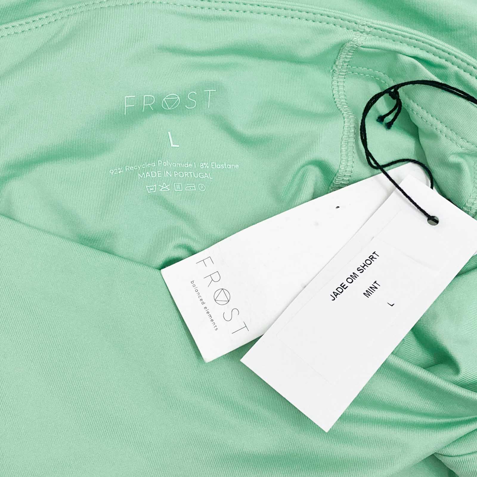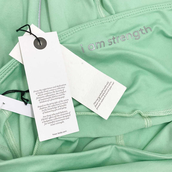 Frost Body by Sadie Frost mint green Jade Om cycling/yoga shorts in size L. The shorts feature reflective piping detail on the sides and a hidden 'i am strength' affirmation graphic on the internal waistband. Made in Portugal. New with tags and no obvious flaws.Details
