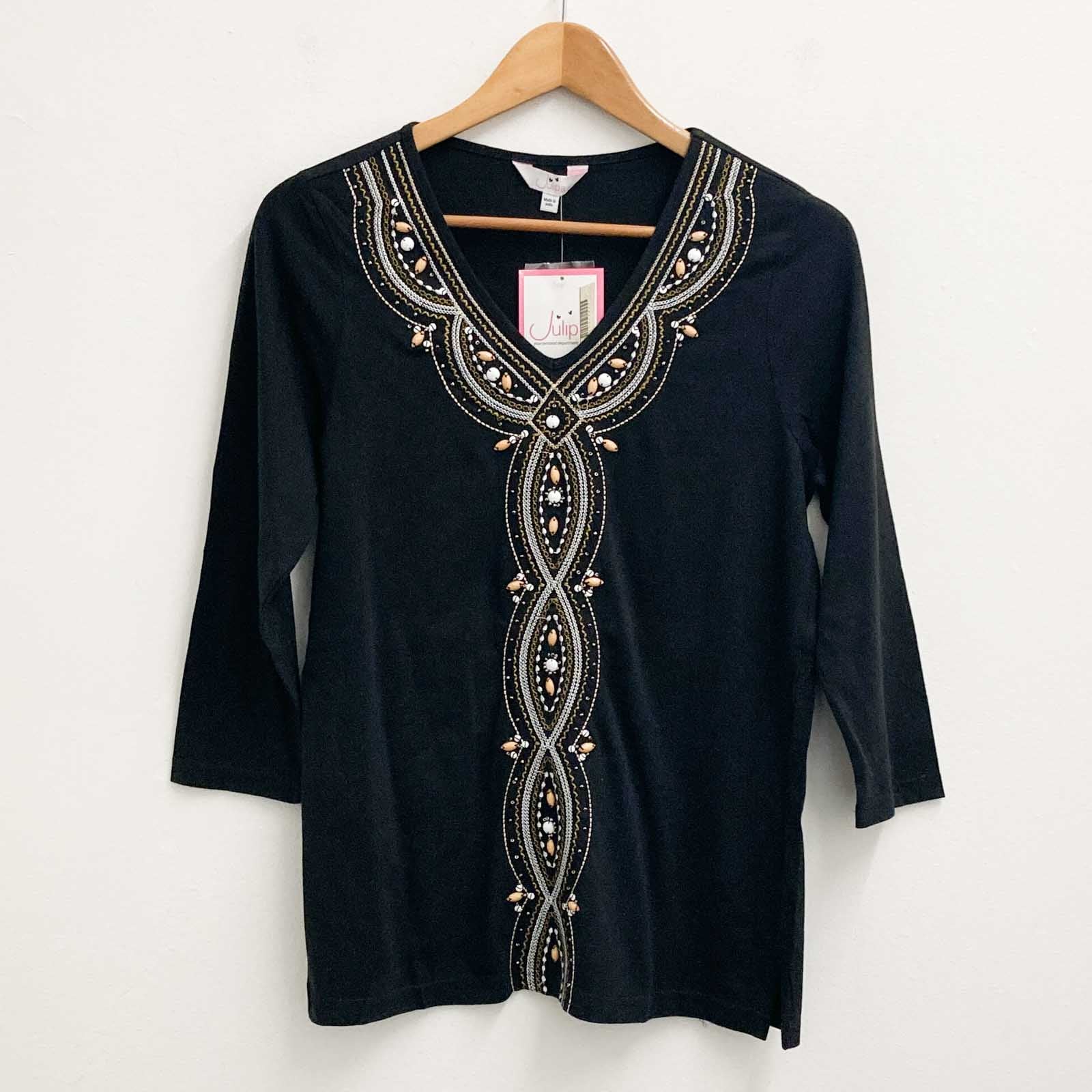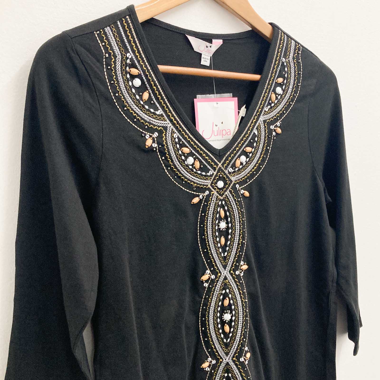 Julipa black embellished v-neck 3/4 sleeve cotton top in UK 10. Features: - Beading and embroidery on the front - 100% cotton New with tags and in excellent condition. There is a loose bead on the front (see photos).Details