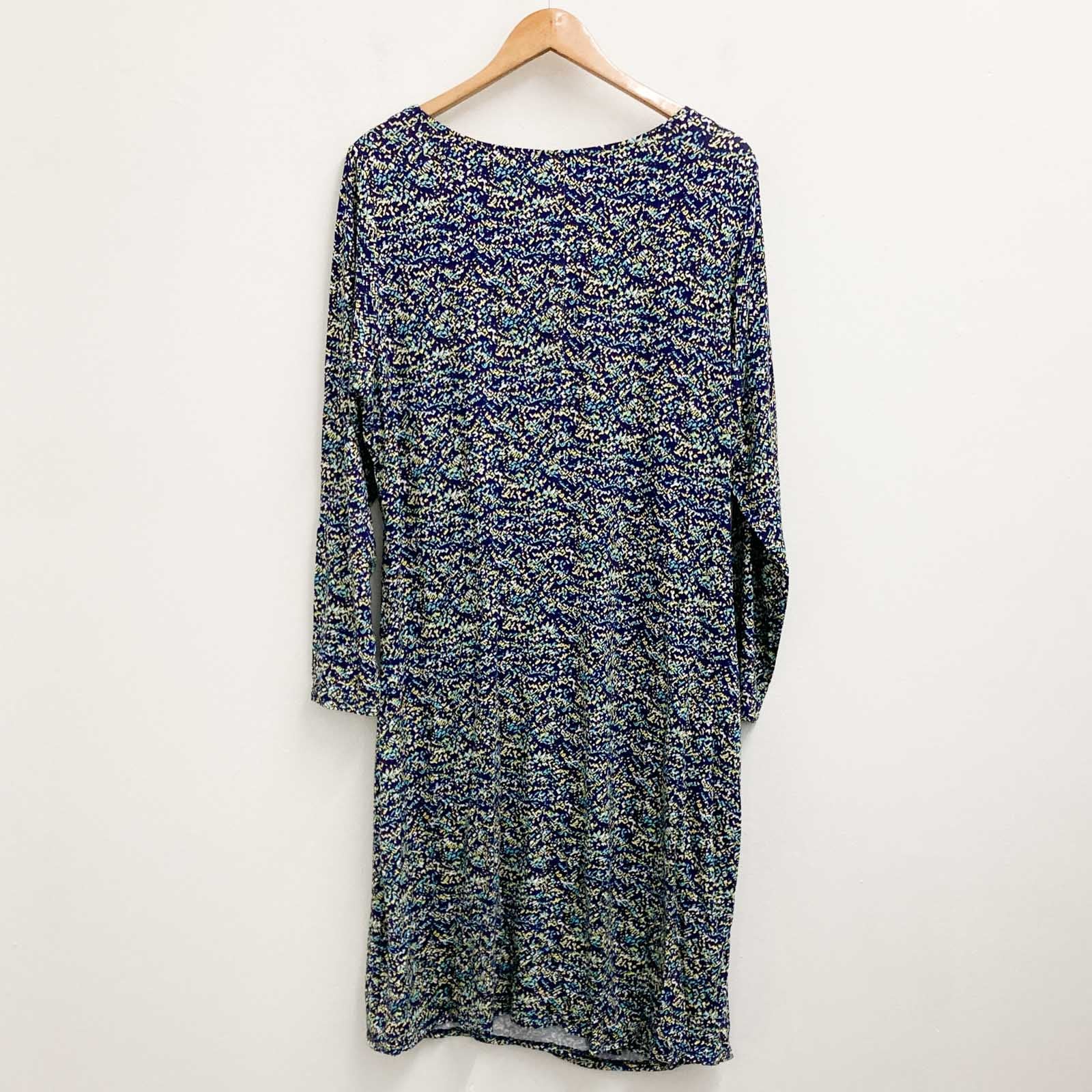 Lily Ella navy printed long sleeve stretch jersey dress in UK 22. Features: - Scoop neck - Front waist seam - Side ruched bodice - Curved mock wrap skirt - Centre back seam Brand new with tags and no obvious flaws.Details