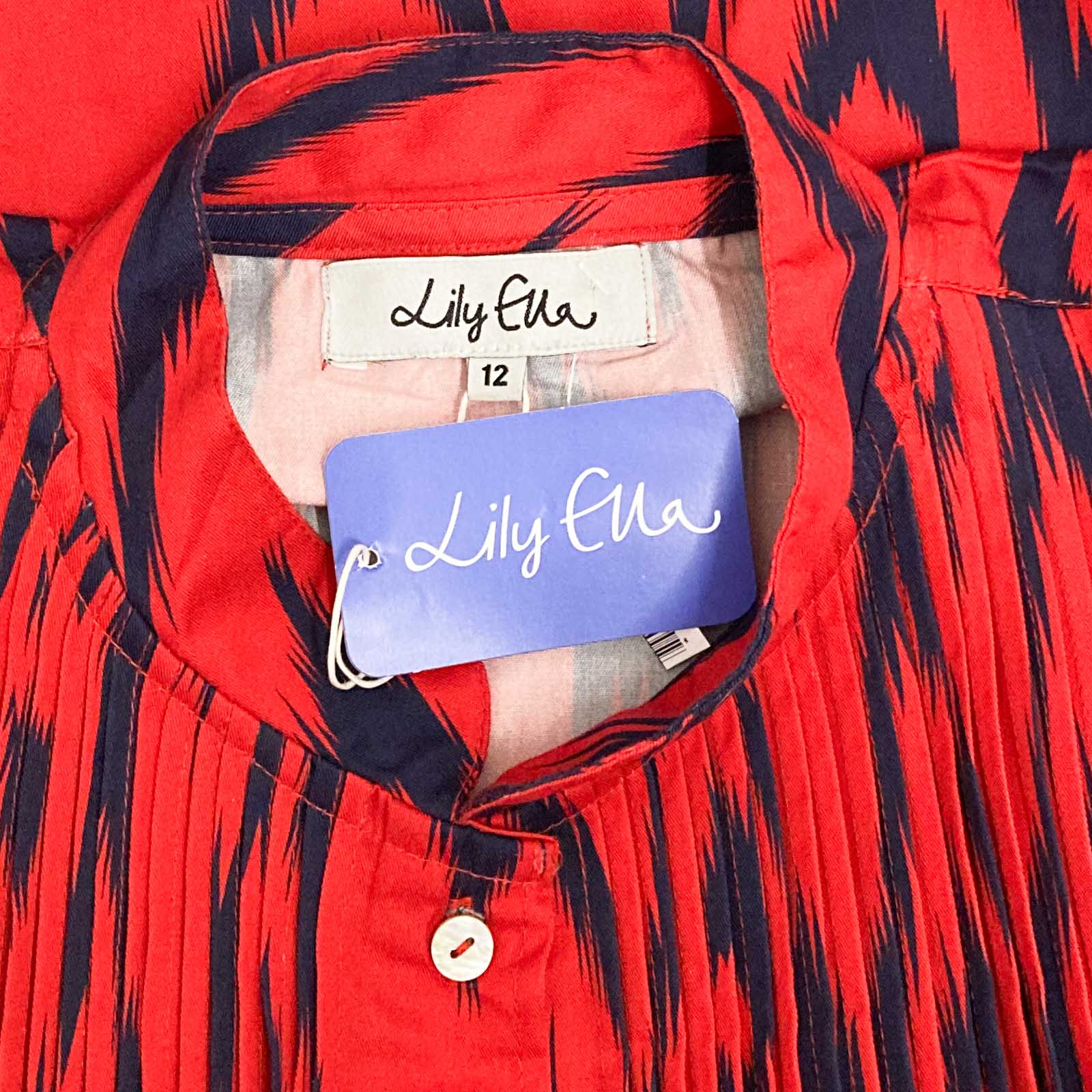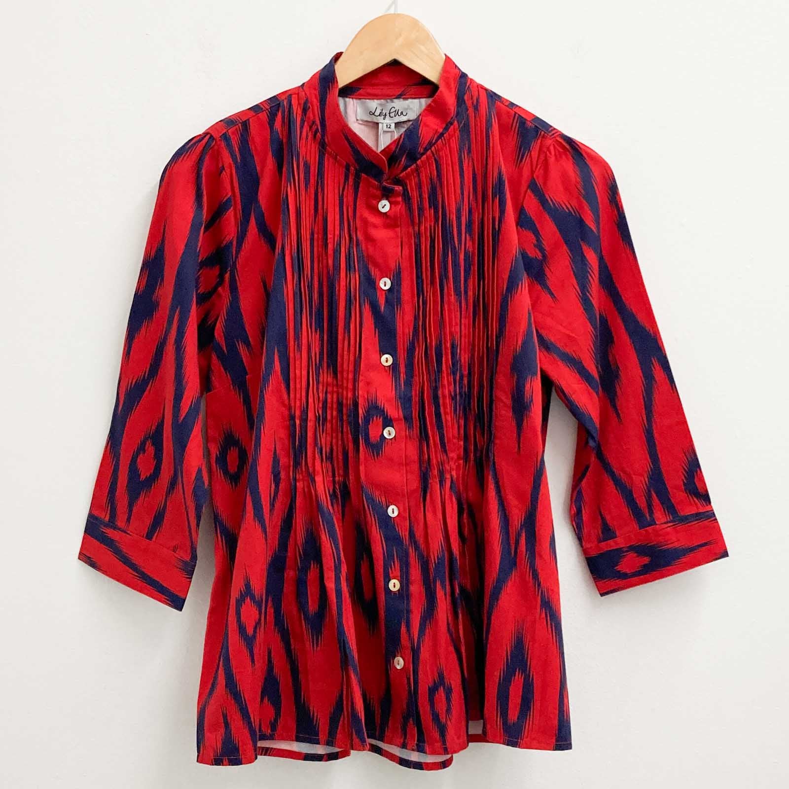 Lily Ella red and navy ikat print cotton 3/4 sleeve blouse in UK 12. Features: - Smock shape - 3/4 sleeves with cuff and button band - Gentle shoulder puffs - Bust darts - Front pin tucks to waist - Mandarin collar Brand new with tags and no obvious flaws.Details