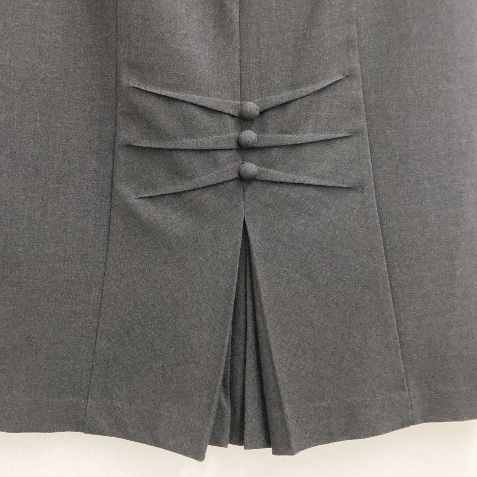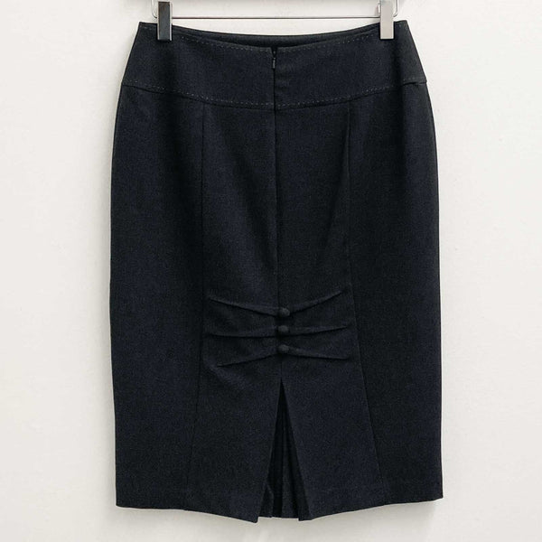 M&S charcoal grey straight knee length skirt. UK 8. Features: - Pleated fabric and button detail at the back - Contrast stitching on waistband - Zip fastening at the back - Lined In excellent used condition with no obvious flaws.Details