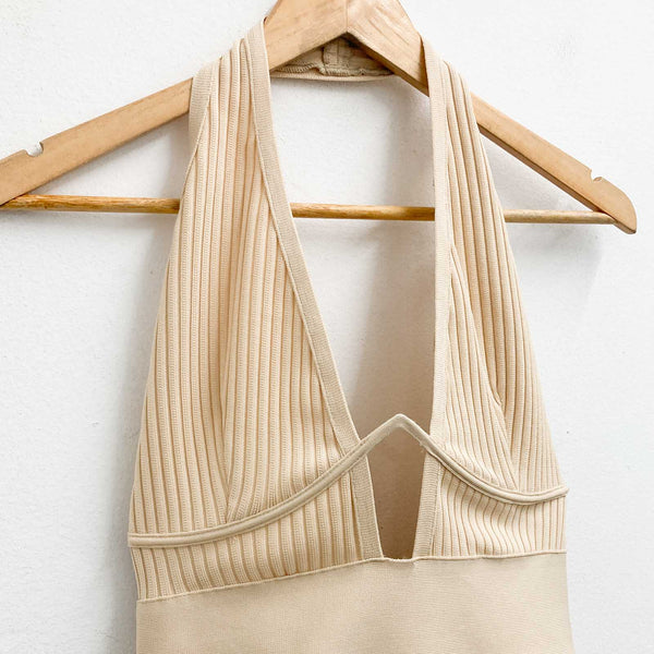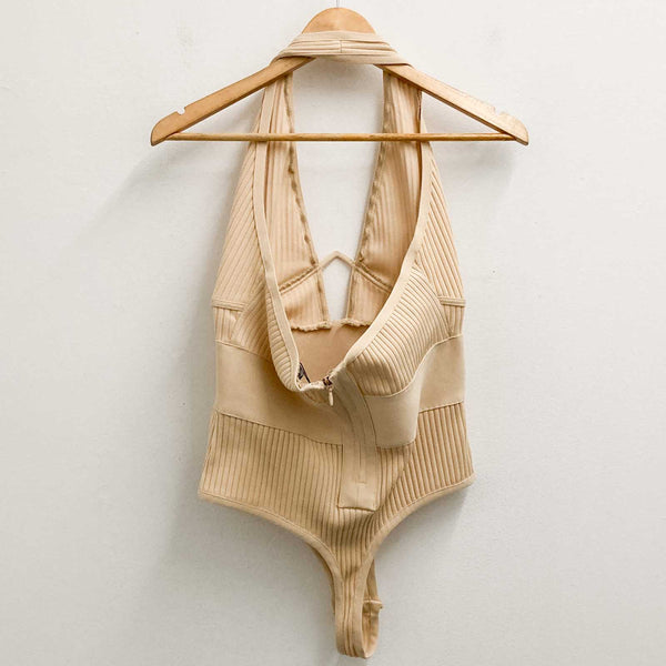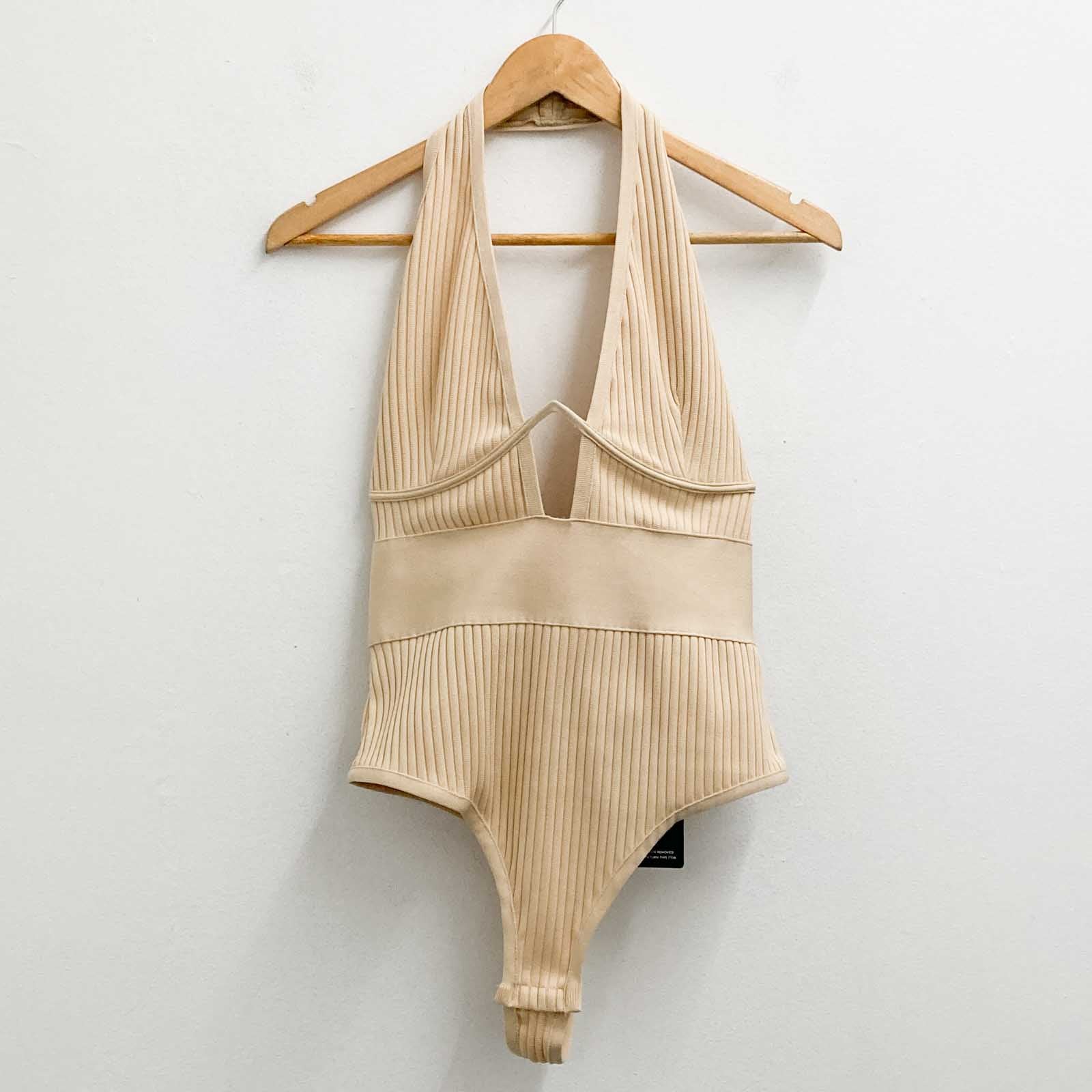 Pretty Little Thing nude bandage rib v-neck halterneck bodysuit. UK 12. Features: - Wire under the bust - Rib fabric - Zip at the back New with tags and no obvious flaws.Details