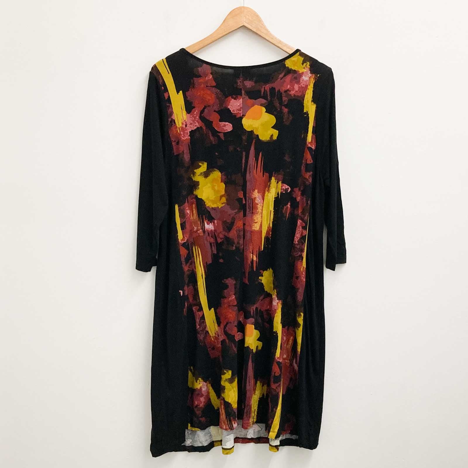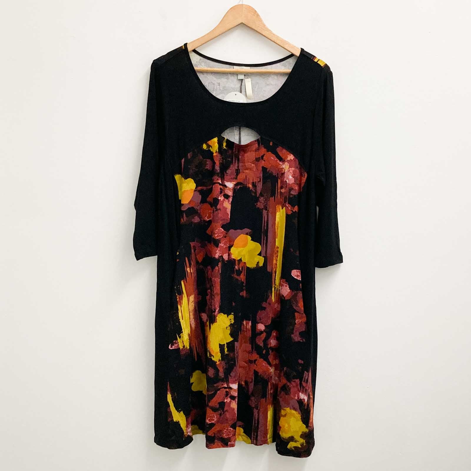 Zim & Zoe by City Chic black cut-out knee length dress with autumnal floral print on the front. UK 16. Key Features Include: - Round neckline - 3/4 length sleeves - Pullover style - Peekaboo keyhole cut-out to bust - Spliced print design to front and back - Functional front slash pockets - Relaxed fit - Soft stretch fabrication - Knee length hemline New with tags and no obvious flaws.Details